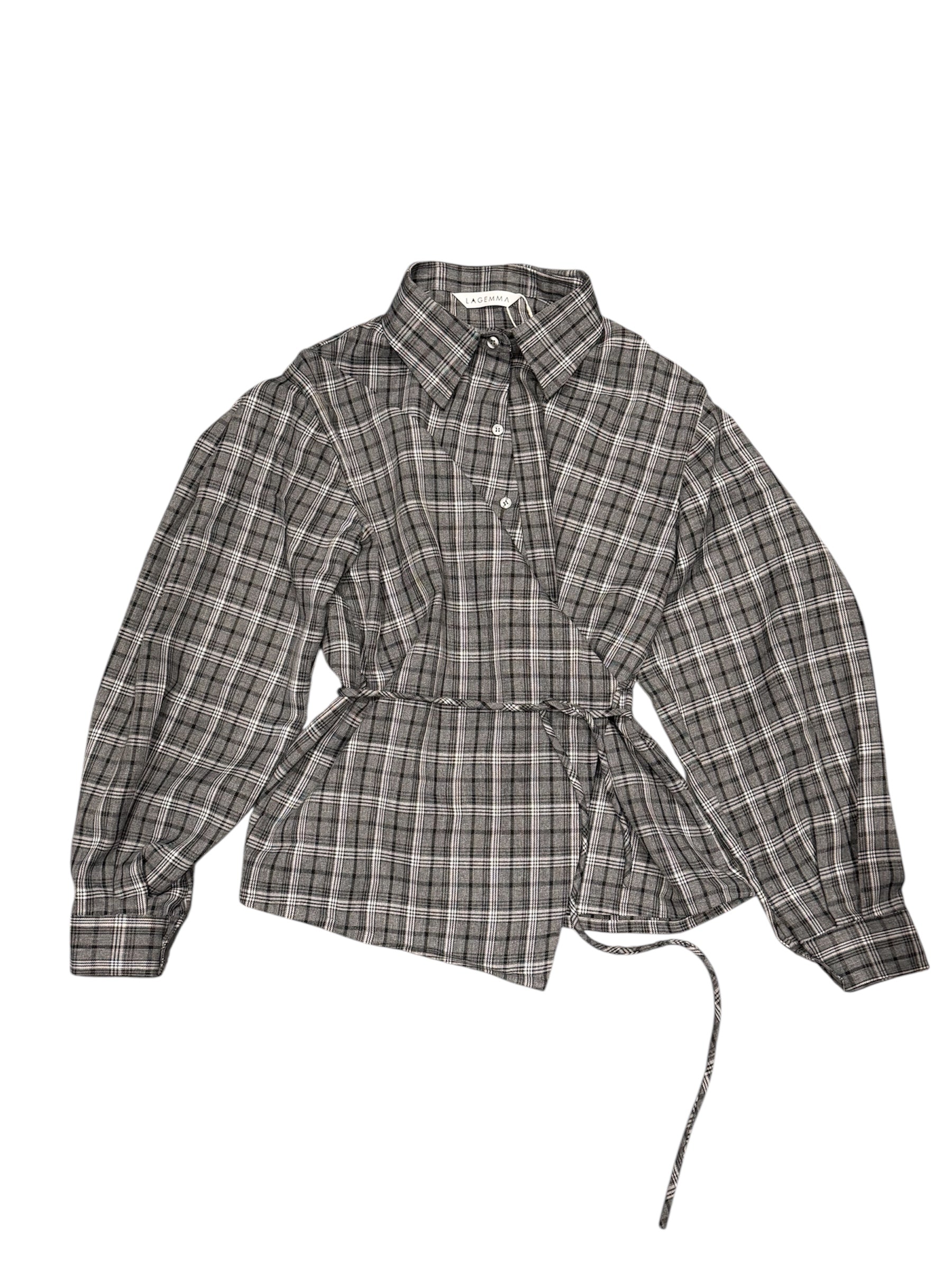 Striped shirt with a collar and long sleeves, featuring a front wrap tie hem for a stylish accent.