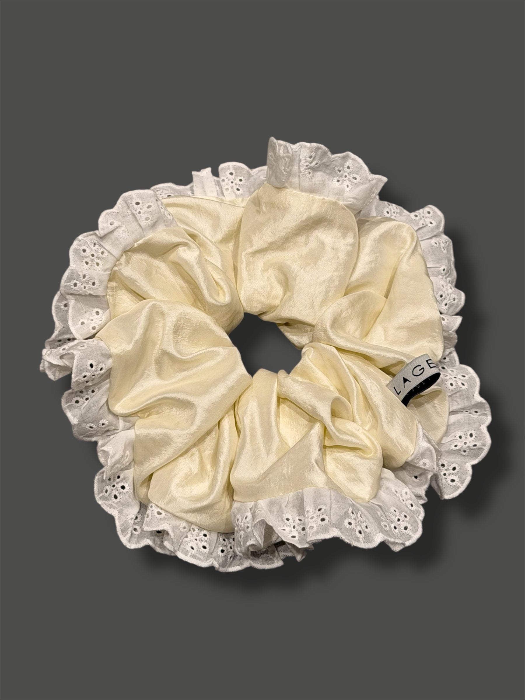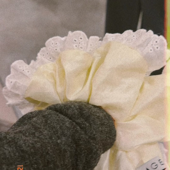 An oversized ( xxl) hair scrunchie made from cream-colored taffeta fabric, finished with delicate cotton lace trim.