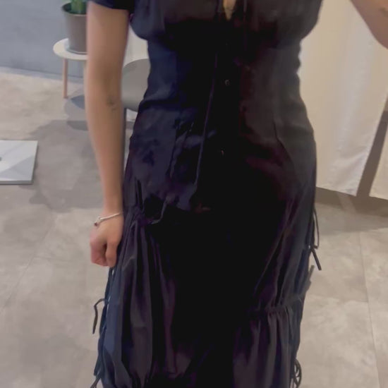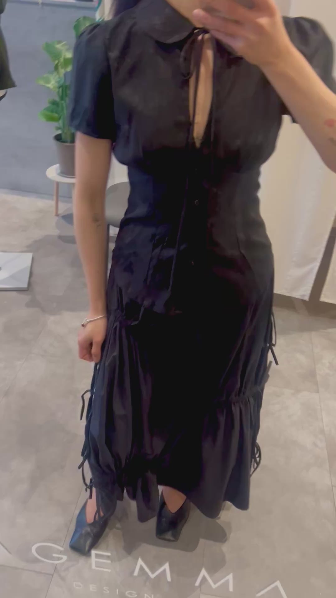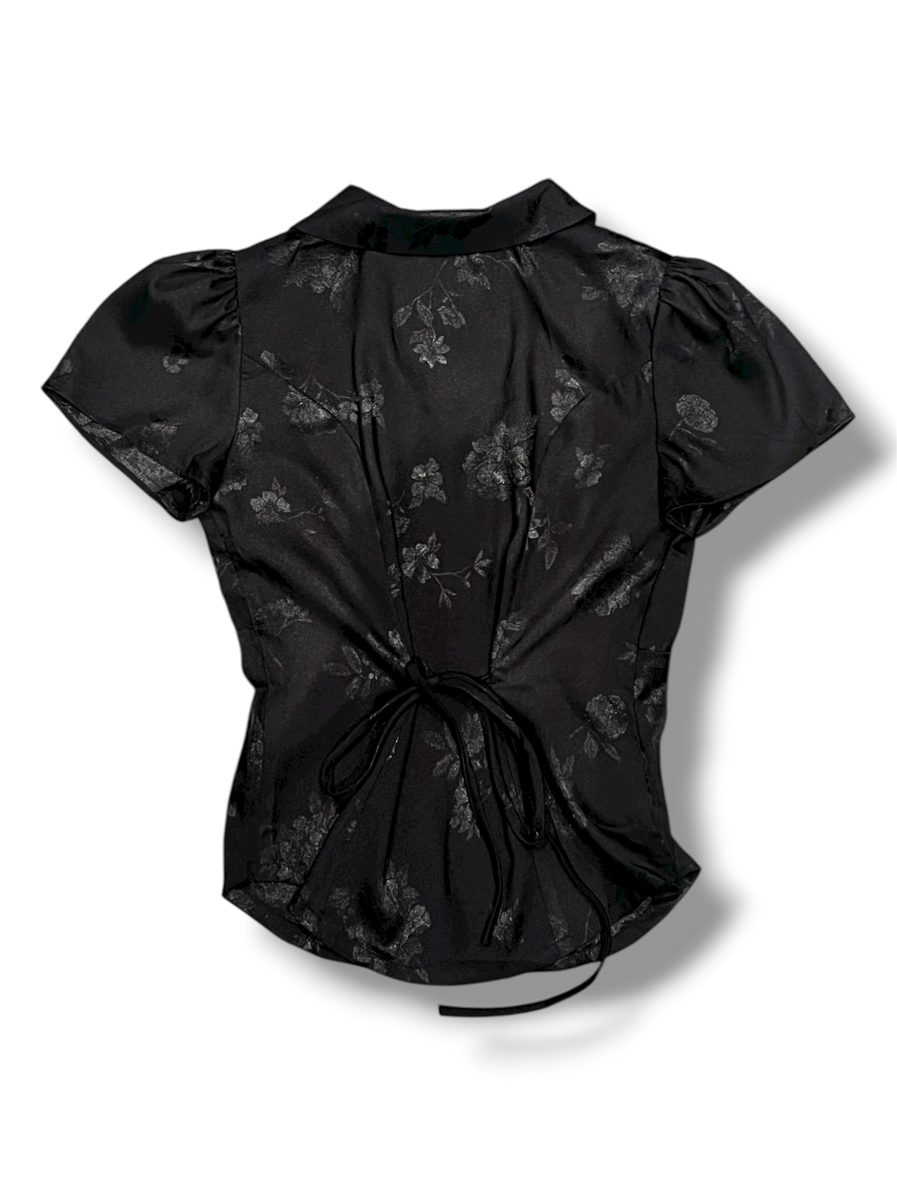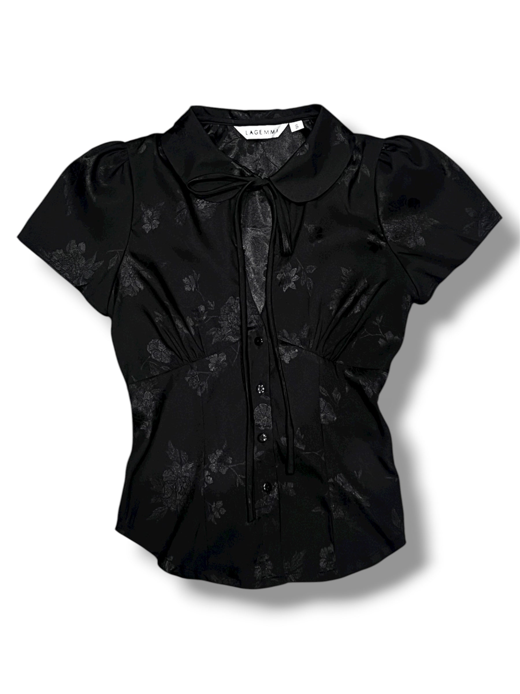 Short-sleeve jacquard top featuring a Peter Pan collar with tie detail and front button closure. Designed with an adjustable back tie to cinch the waist for a flattering fit. Elegant and full of charm — pair it with a black skirt for a classic look or with jeans for an effortless everyday style.