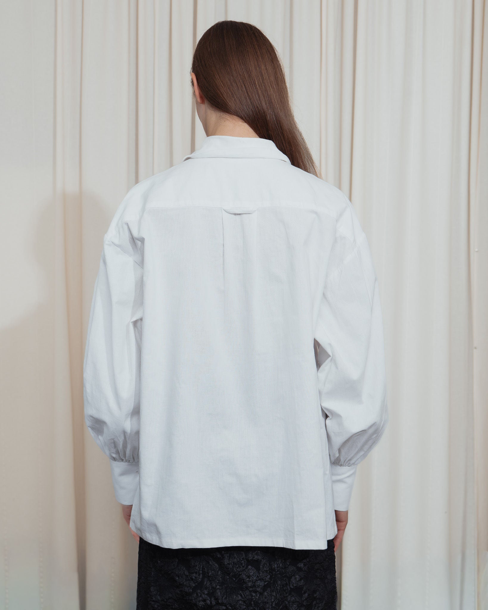 Oversized shirt crafted from 100% linen in crisp white. Designed with voluminous long sleeves and an extended collar that can be styled as a tie or draped like a scarf. Lightweight and effortlessly elegant, this piece offers a relaxed yet refined silhouette — perfect for both casual and elevated looks.