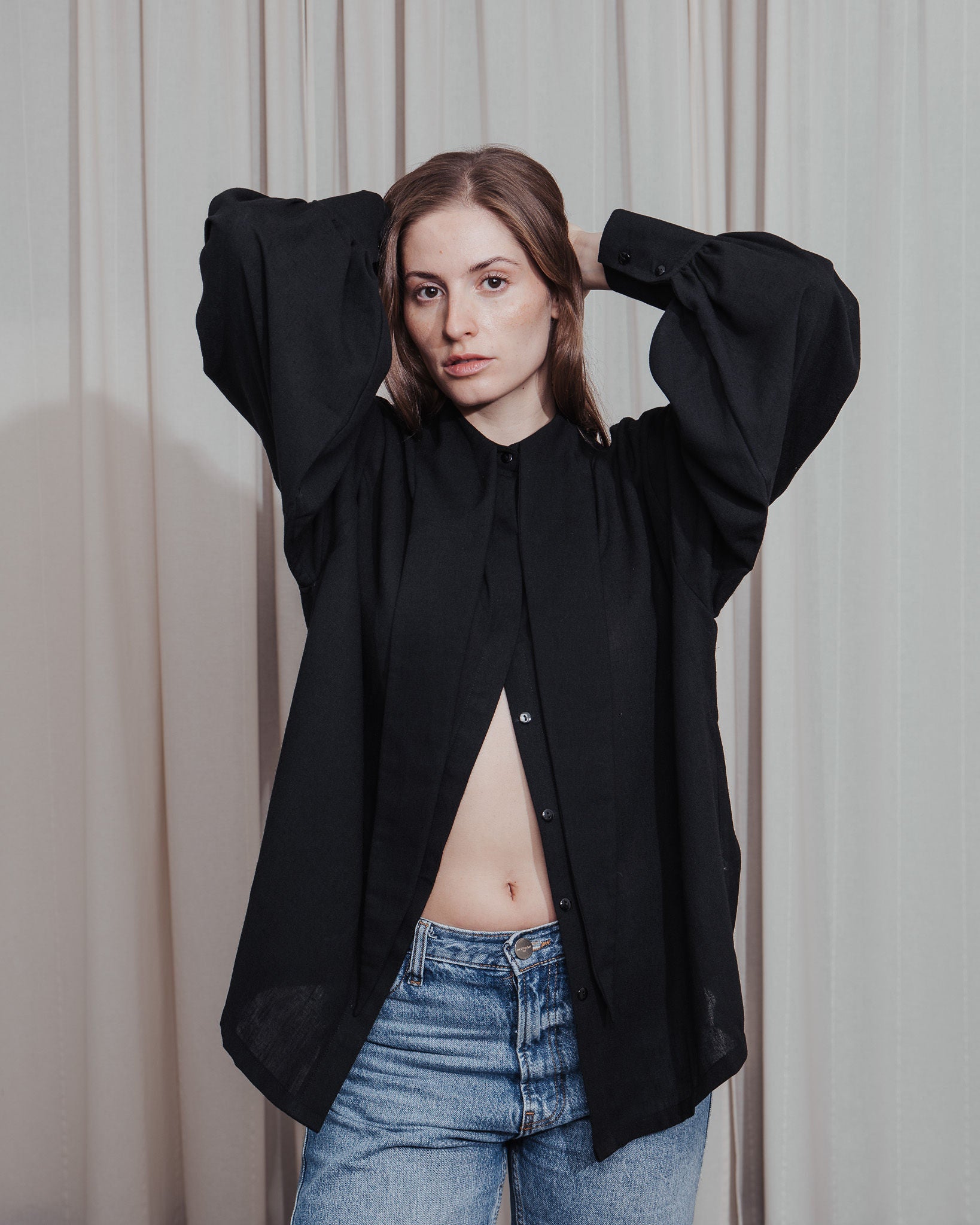 Oversized shirt crafted from Linen/Cotton in black. Designed with voluminous long sleeves and an extended collar that can be styled as a tie or draped like a scarf. Lightweight and effortlessly elegant, this piece offers a relaxed yet refined silhouette — perfect for both casual and elevated looks.