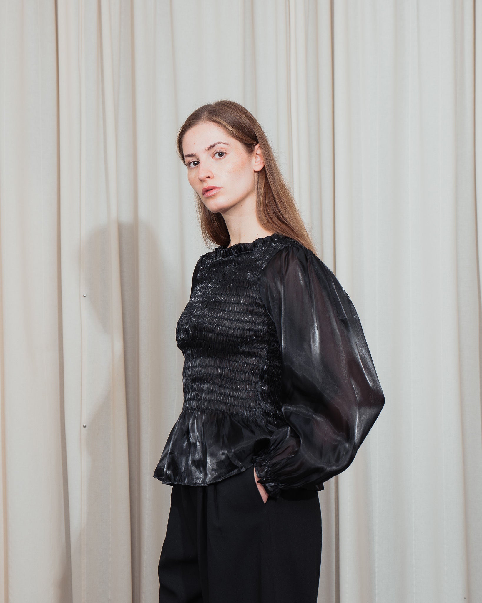 Organza top featuring a fully smocked bodice and long puff sleeves. Finished with a peplum hem for a flattering, feminine silhouette. Lightweight and airy, this piece combines elegance with a modern, textured detail.